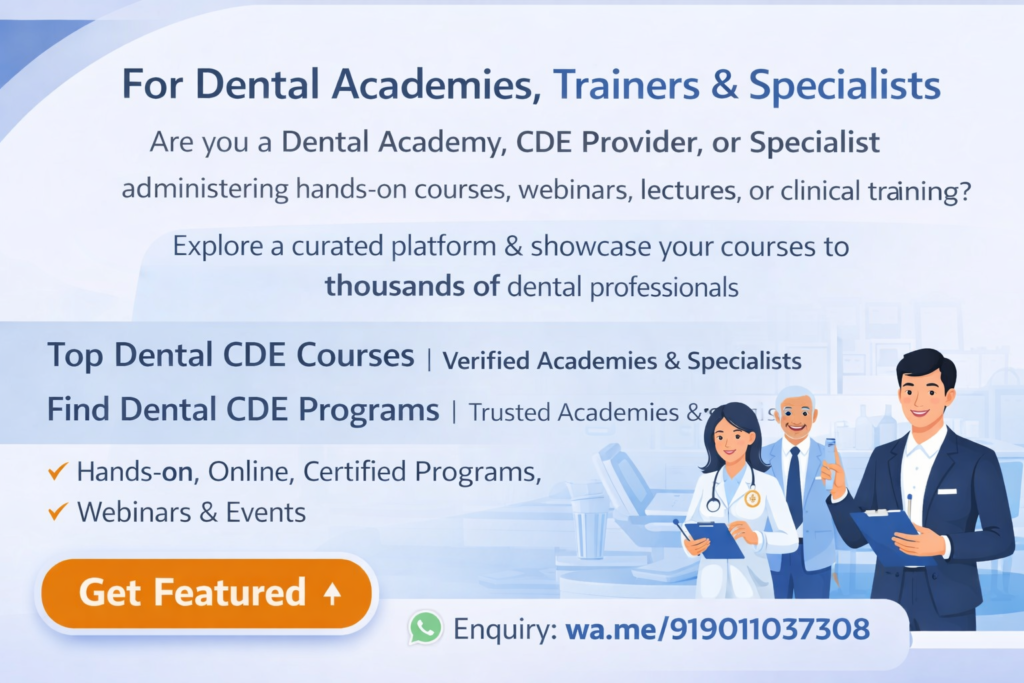 Discover a curated list of Dental CDE Courses, Training Programs, and Workshops offered by verified academies and experienced specialists across India. Whether you’re a dental student, fresher, or practicing dentist, find the right opportunities to enhance your clinical skills and advance your career.